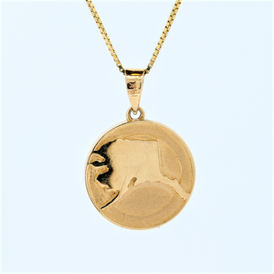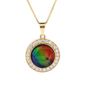 14Kt Yellow Gold Ammolite And Diamond Pendant, Featuring One Round Ammolite Gemstone In A Classic Bezel, Encircled By A "Halo" Of 25 Round Brilliant Cut Diamonds, Each Stone Set In A Special Shared 4 Prong Setting. On Its Reverse Side It Is Finished With Solid High Polish Finish And Engraved Is A Map Of The State Of 'Alaska" What Makes Ammolite A True Alaskan Keepsake Is The Rainbow Of Colors That Resembles The Aurora Borealis, Popularly Known As Northern Lights That Natural Light Display In The Earth's Sky, Predominantly Seen In Alaska. The Ammolite Gemstone Is Graded as AAA (Highest Quality) As It Contains 3 Or More Distinct Vibrant Colors From Any Angle. The Diamonds Are Graded As F-G In Color With Vs2-Si1 In Clarity For A Total Of 0.50 Carat.